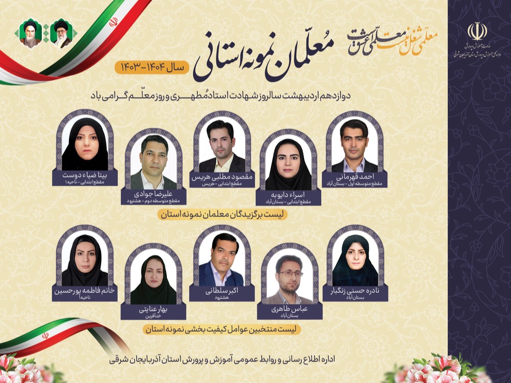 معلمان نمونه و عوامل نمونه کیفیتبخشی استان آذربایجان شرقی در سال تحصیلی ۱۴۰۴-۱۴۰۳، معرفی شدند و ۱۰ نفر از این پنج ناحیه و منطقه استان موفق به کسب عنوان نمونه استانی شدند.